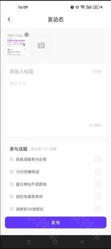 3、进入编辑页面,输入标题以及内容,选择参加话题,点击发布”选项即可