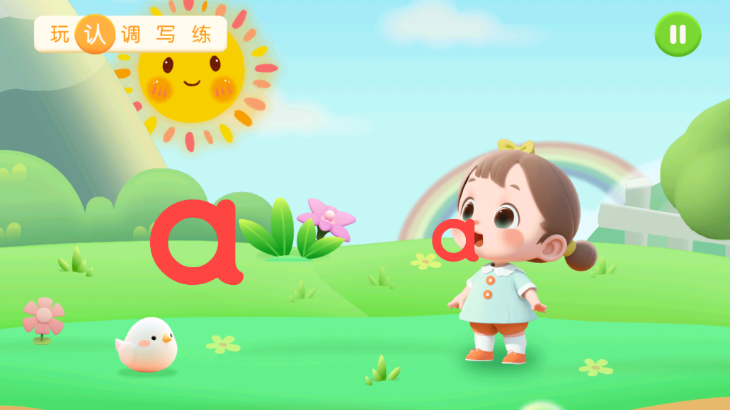 精心定制63个趣味拼音内容,采用了玩、认、调、写、拼、练6个步骤,通过完整的科学闭环,让孩子在趣味互动中循序渐进掌握拼音。