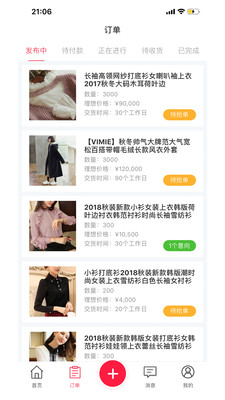 订单管理功能,包括发布中、待付款、正在进行、待收货、已完成,管理不同订单的进度;