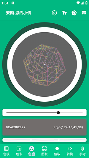 图取:您可以选择一张本地图片或者在网上下载图片然后选取,从图片取色,点击"+"号选择图片,再点击一次清除图片,继续点击重新选择图片。当您选择图片之后,如果直接进行颜色值复制操作,这将会直接把操作提示的两句话其一复制到您的剪切板,您需要从预览图中拖动准心或者拖动其下方的横坐标或纵坐标才能获取图片中的颜色。需要注意的是,如果是拖动图片预览区的准心,您需要上下方向微微拖动一下使得该区域的拖拽工作顺利进行,而如果手指刚接触屏幕就左右拖动,那么您激活的是左右翻页功能,这是多个滑动控件结构的界面,因此您需要使用恰当的触控方式获得对应的操作响应。