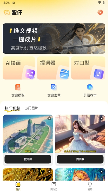 波仔AI助手这是一款人工智能的写作应用,里面有很多热门的视频和图片,只要点击一下,就能制作出一款热门的视频,让你很容易就能制作出热门的视频,而且很容易上手,有兴趣的朋友可以来下载哦!小编相信你一定会喜欢上这款app的!