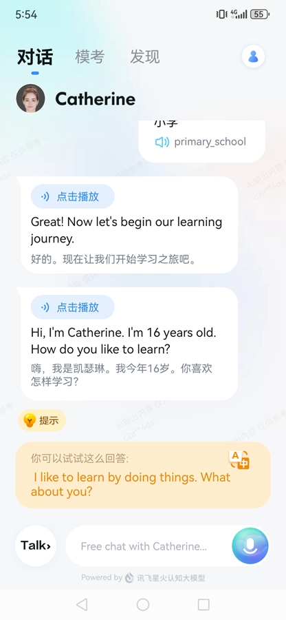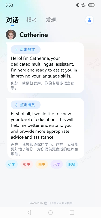 《星火语伴app》是讯飞旗下公司广州讯飞易听说网络科技有限公司推出的一款手机英语学习软件,进入软件后朋友们可以选择自己的学历,比如小学、初中等,可以选择自己的兴趣爱好等即可与AI进行对话,可以手动输入也可以语音输入,软件中还有着模考等众多功能可以选择。