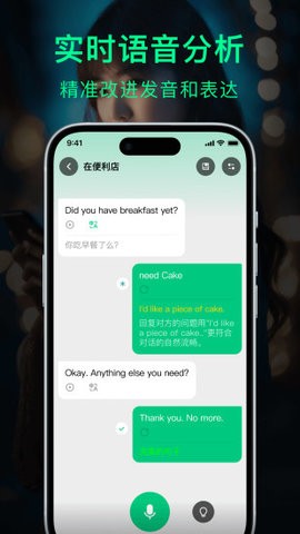 1、软件提供了多种灵活的学习方式,包括从基本的中文输入和翻译练习开始,也有英语对话训练。