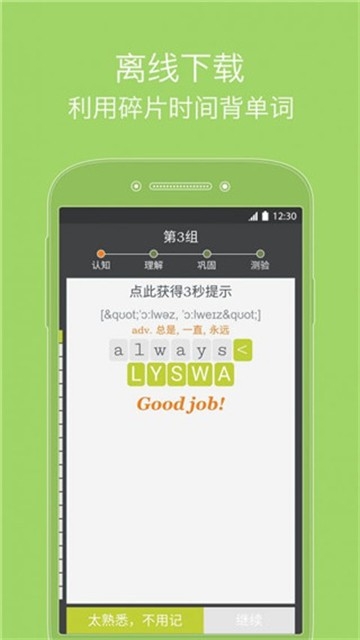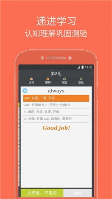 我爱背单词app采用排序记忆力单词,每一组20个单词,将单词记诵切分为单独小段,并出示独特的递进式学习方式:依照认知→了解→推进→测试的过程,保证学习者铭记并灵活运用单词应用。