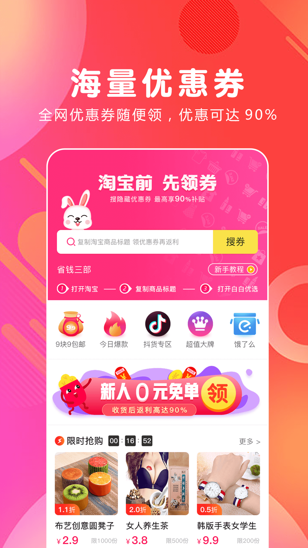 2、购物领补贴,低价折扣买好货,优惠券满减更划算。