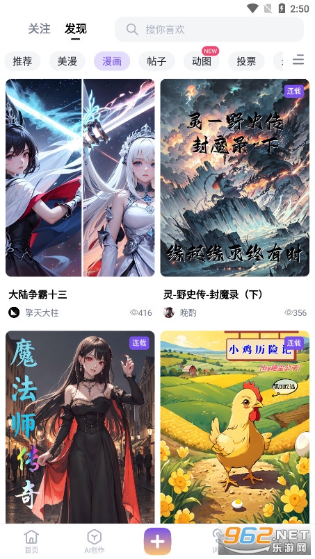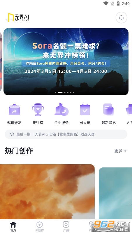 1、想用无界版图app进行ai绘画,只需要打开app,进入首页点击屏幕下放侧的 “AI创作”