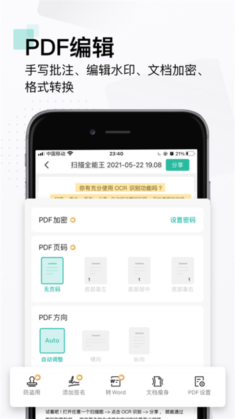 AI全能扫描王智能扫描图片、文档的文字提取,还可以简单编辑PDF文件,将PDF文件转化成为Word文档,可以导出来,在任何处理文档的软件上使用,不乱码排版清晰。软件支持多种格式的文档保存,所有数据电脑端、手机端同步,您可以随时调取文档资料查看,还可以翻译成包含中、英、法在内的41中语言,功能强大好用!
