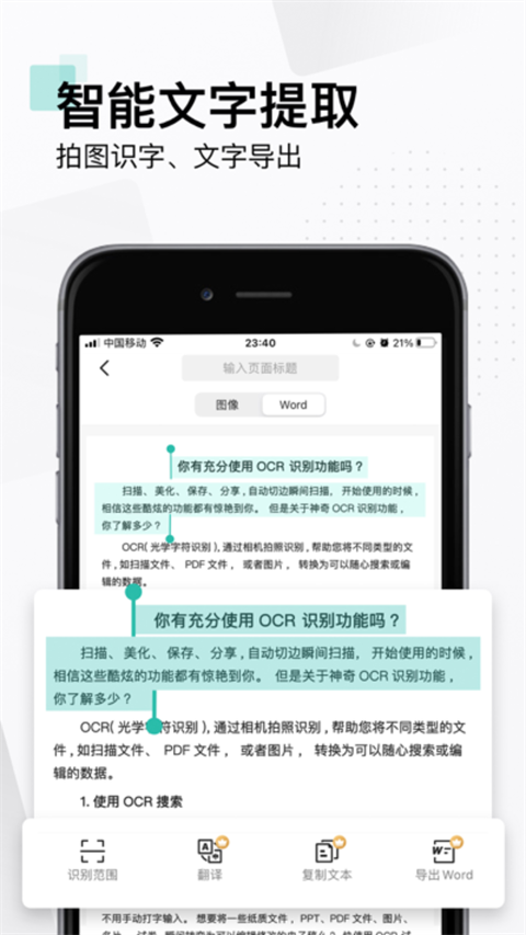 支持识别中、英、日、韩、葡、法等 41种语言,还能一键复制、编辑图片上的文字,支持导出为 Word/Text格式。