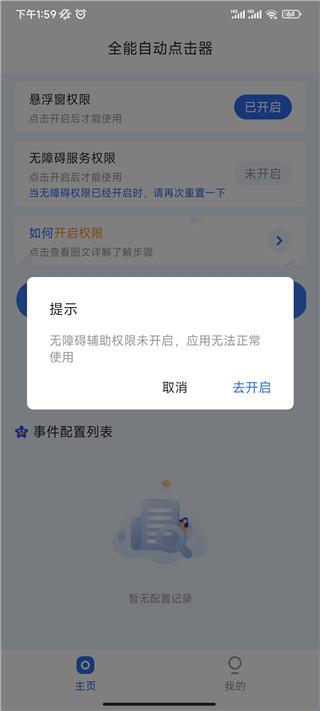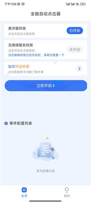 1、下载进入全能自动点击器app,在主页中你需要开启悬浮窗权限和无障碍服务权限;