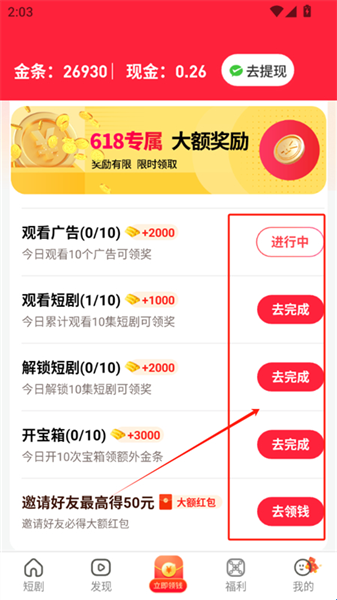 3、完成观看短剧任务,也可以获得更多的红包奖励