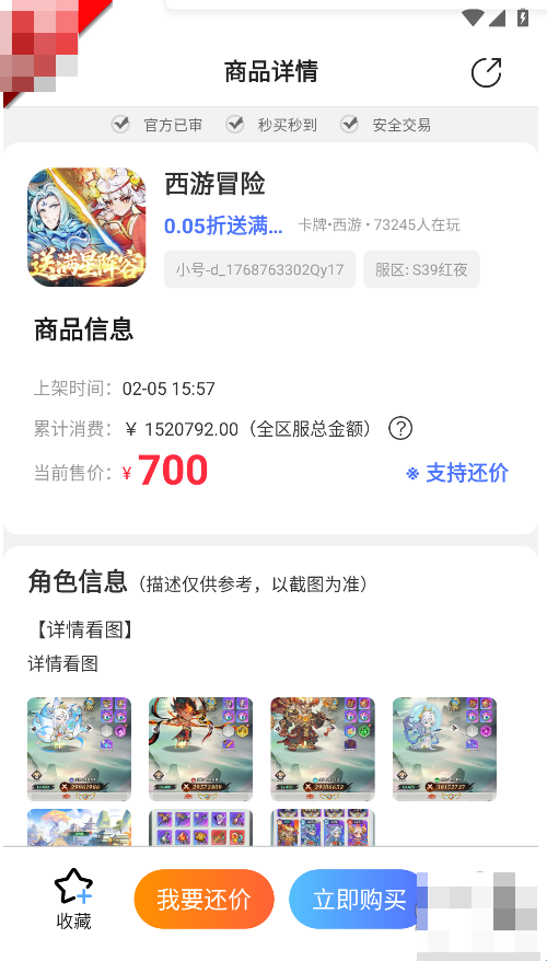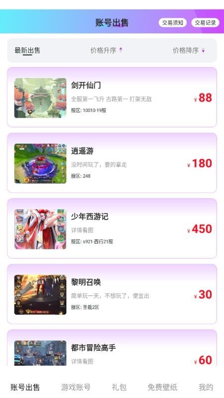 4、账号筛选:可通过价格、最新推送等条件筛选游戏账号,方便找到喜欢的账号并直接在线交易;