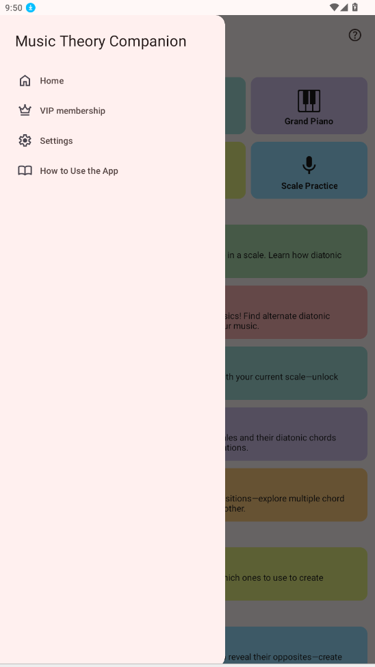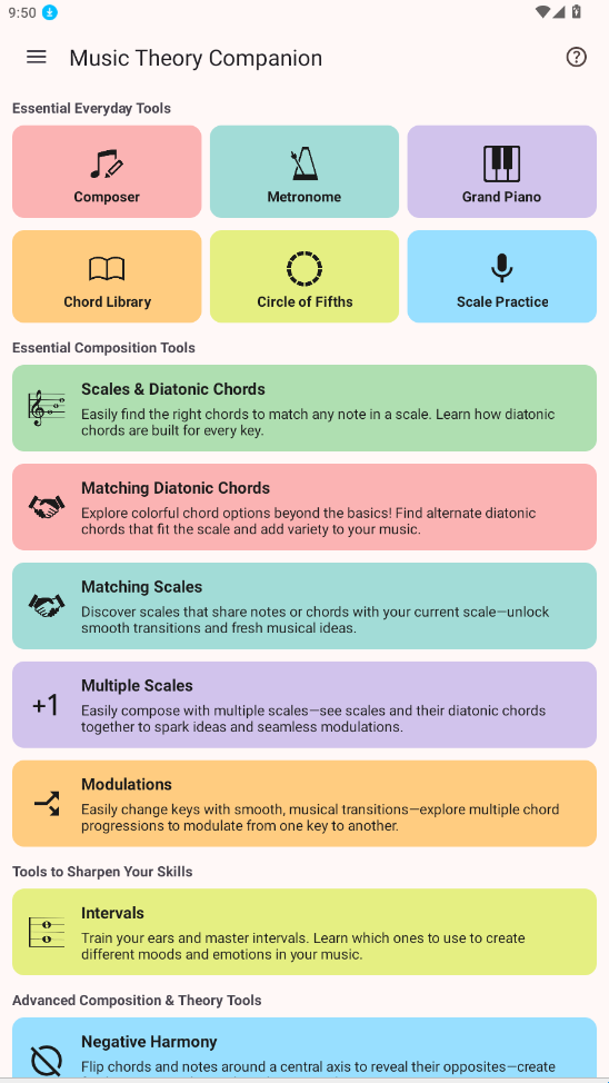 你可以从应用中选择工具生成和弦、音阶或调式,或通过练习部分进行听力训练和视奏训练。应用的界面简单易懂,帮助用户快速掌握和提升音乐理论知识。