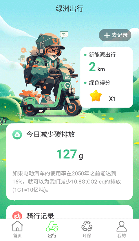 3、【出行】页面右上角“去记录”,随时记录生活中的低碳出行里程数;