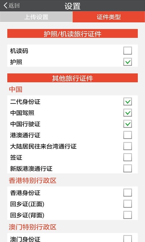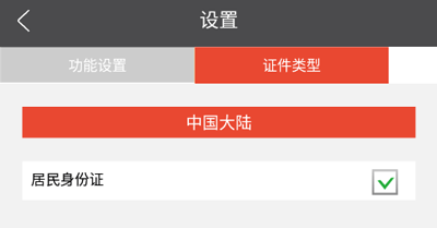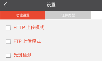 1、设置:按钮,进行上传设置或证件类型的选择。
