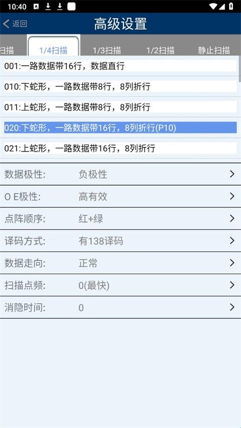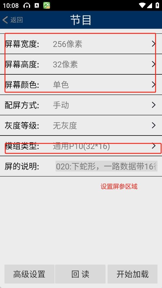 1、点击配置,进入配置界面,请按显示屏的实际参数进行设置,并选择好相应模组。设置好之后,点击开始加载,加载成功后进入显示屏主界面,若需要调试数据极性,OE极性,扫描点频,进入高级设置进行选择,下次使用只需“回读”即可,无需再次加载。