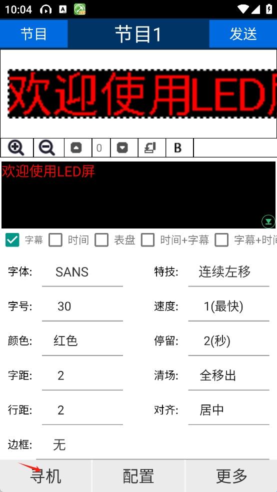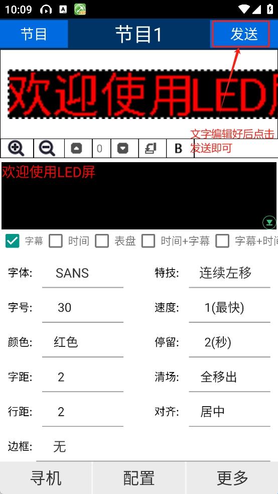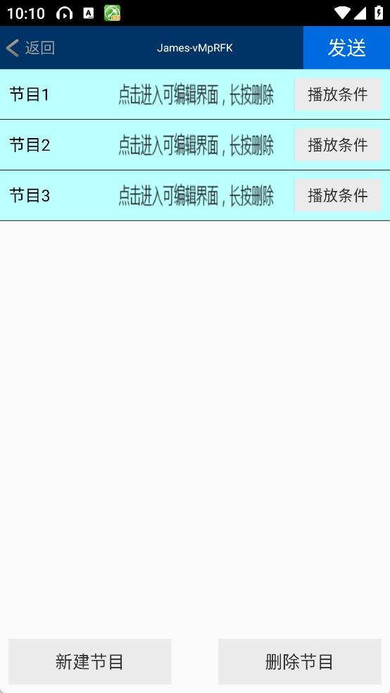 第三步:如果你需要多节目,就点击左上角节目,进入节目界面。点击新建节目,然后点击你新建的节目条,进入主界面编辑内容,同第三步操作。完成后直接点击发送按钮。