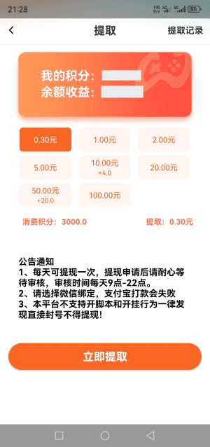 4、提现规则:满0.3元提现,每天可提现1次,审核时间为9点-22点,审核完成后,需要再次跳转到领取