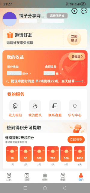 3、邀请好友:邀请好友得最高39元奖励,推广团长可开团,普通团长享12%+5%收益,高级团长享20%+8%收益