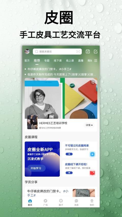 皮圈商城专门为皮革匠人设计的社交论坛类APP,这里汇集着各种爱好皮具的用户,你可以在这获得来自各种渠道关于皮革的消息,交流你们的相关心得,还可以选择如何制作皮革作品。线上的课程用户可以免费学习,还可以在线咨询其他用户学习经验,在线晒出你的作品,请教指点让你每一次的设计更加完善,创造属于你的精彩故事!