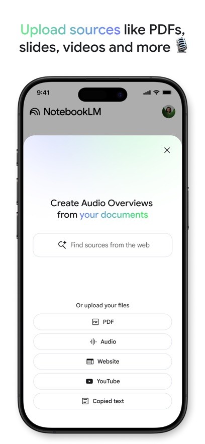 1、多格式资料整合:支持上传PDF、Google文档/幻灯片、网页链接、YouTube视频、音频文件及纯文本等多元素材,自动提取关键信息并建立跨文件主题关联,解决信息碎片化难题,实现“一站式”知识库搭建。