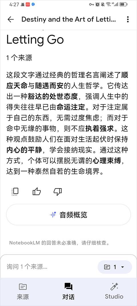 自由提问:在底部的对话框里,像问老师一样提问。比如:“这篇文章的核心论点是什么?”或者“对比一下来源 A和来源 B在这个问题上的看法有什么不同?”生成音频概览(Audio Overview):点击 "Notebook Guide"区域的 "Audio Overview" -> "Generate"。等几分钟,它就会生成一段类似播客的英文双人对话,帮你总结这些文档。