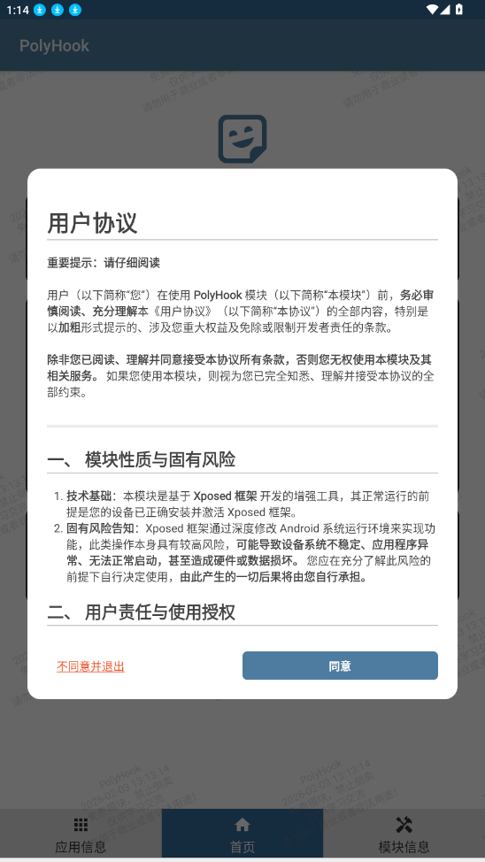 2、第三方应用授权:如您使用本模板对任何第三方应用进行修改或调试,您必须确保您已事先获得该应用权利人的明确合法授权。未经授权进行修改或调试所引发的一切法律责任(包括但不限于侵权责任、行政处罚)及后果(包括但不限于应用异常、账号封禁、数据丢失、资金损失),均由您自行承担全部责任。开发者默认您的使用行为已获得必要授权。