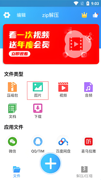 1、打开zip解压app,点击“图片”;