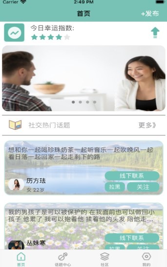 墨泛社友是一款非常出色的聊天交友软件,这款软件对于喜欢交友的用户来说是一个非常好的选择,平台聚集众多用户,更有各种热门社交话题供您选择,让您随时随地享受更轻松的交友聊天体验。