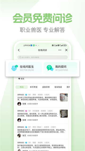 ◆养宠工具:包含在线问诊、驱虫选药、疾病自查、用药自查、能不能吃、能不能做、宠物取名、知识库8大特色工具,更有执业兽医师免费在线一对一问诊,有问必答,专业可靠详细易懂!