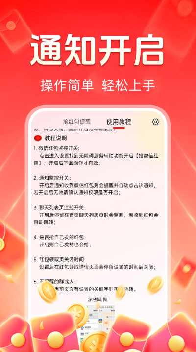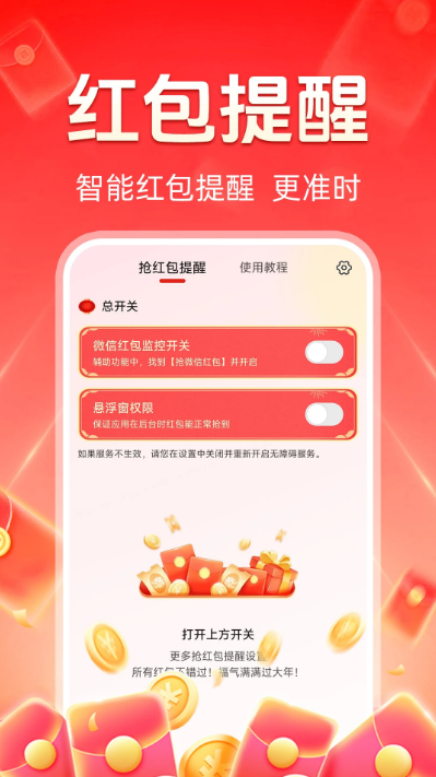 抢红包秒提醒最新版2026分享给大家,这是一款专为提醒大家抢红包而设计的工具。当红包消息到来时,软件会快速发出通知,确保大家不错过任何抢红包的机会。无论是群里的红包雨,还是朋友发来的专属红包,这款软件都能帮你第一时间发现!