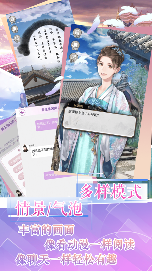 3、动人故事,互动阅读,多线剧情故事是灵魂绘制的梦想,我们已然为你铺开画卷、饱蘸浓墨,静待你用炫丽的想象绘制出或盛世江山、或缱绻情浓、或波谲云诡、或岁月静好……