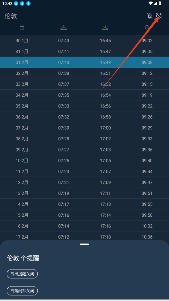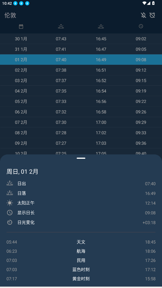 3、点开当前日期可以查看具体显示日长及各种日出时间。