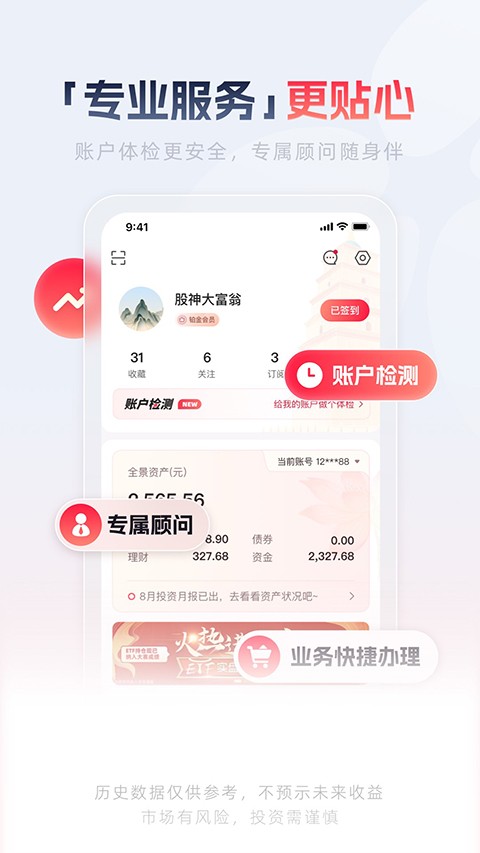 8、投顾组合:参考投顾组合策略,学习科学有效的投资方式,降低投资风险,提高投资稳定性;