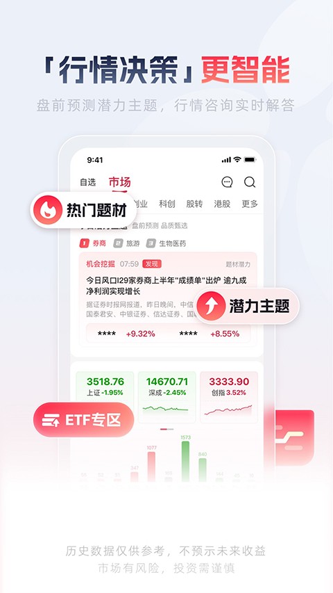 1、市场行情:今日潜力主题、市场快讯、热门题材等,把握市场趋势,助力智能选股;