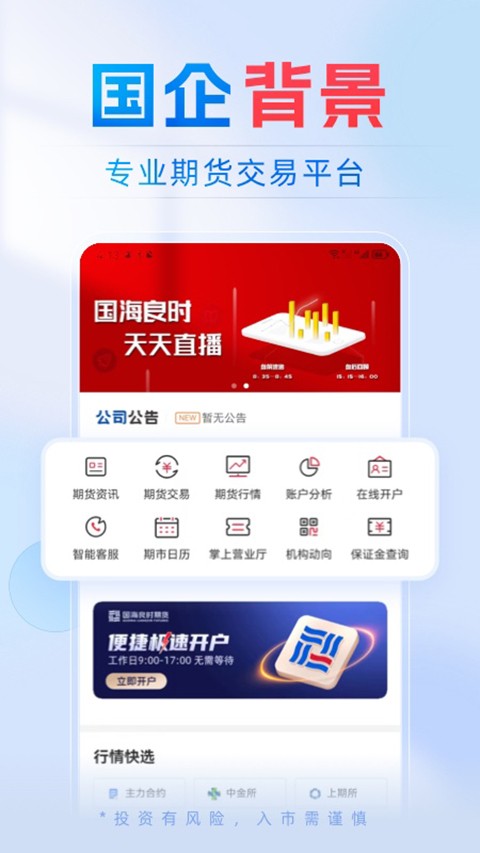 国海良时期货开户是为各位投资者们准备的专业正规的期货交易软件,拥有详细的开户教程方便各位用户在线进行期货账户的开户,还有最新的研报,让各位投资者们可以实时的掌握期货市场的动向,更有期货课堂让你可以快速的告别理财小白,学会合理的配置资产,选择优质的期货进行投资等等,有需要的用户赶紧来本站下载吧。