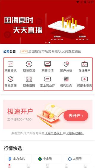 1、在本站下载安装并打开国海良时期货交易app,进入软件首页,为用户提供期货资讯,期货交易、期货行情等多个快捷功能入口。