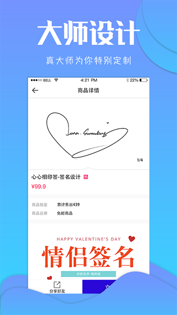 专属签名定制是由上海邱听荷网络科技有限公司打造发布的一款专门做签名设计的手机平台。有了这款软件,再也不用担心自己的签名不好看了,专属的签名定制,一键轻松定制您的专属签名设计,更有一笔签名、连笔签名、商务签名、行楷签名等艺术签名任你挑选。不仅如此,艺术签名app还支持众多艺术设计大师在线为你量身定制的个性手写姓名签名档,设计出一款你的最爱签名,让你受益终生,字体丰富,风格多样,可适用于多种场景,在无形中提高你的个人形象。