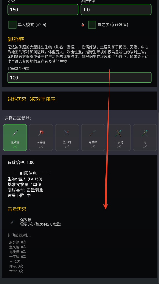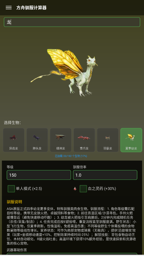 根据恐龙种类、等级和食物类型,自动计算驯服所需时间和消耗量。