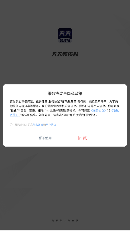 1、在烧荒下载好“天天领皮肤app”点击进入,同意用户权限
