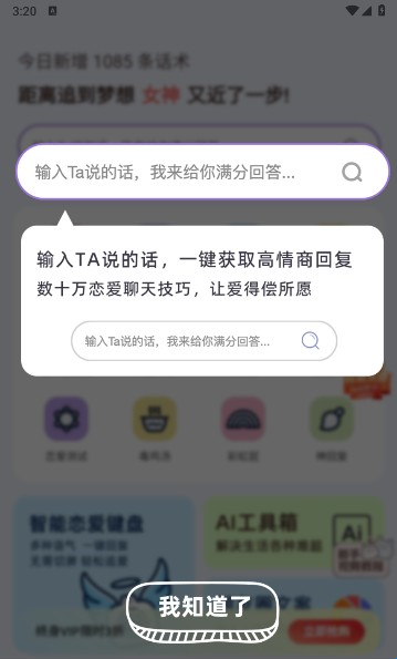 2、在弹出的功能提示界面,点击“我知道了”,了解输入对方话术可获取高情商回复的功能。
