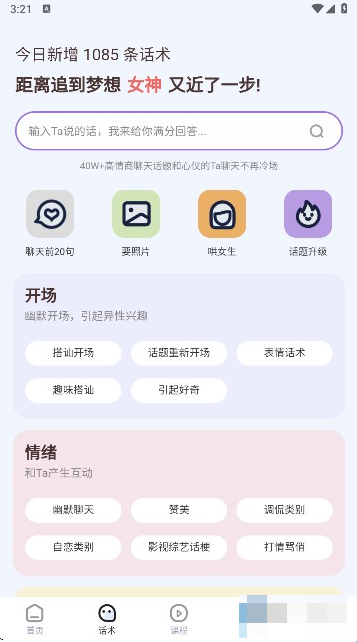 5、点击“话术”板块,可查看“聊天前20句”“要照片”“哄女生”等分类话术,选择适合的聊天场景。