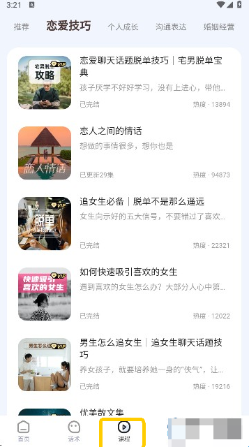 6、进入“课程”板块,可选择“恋爱技巧”“个人成长”等分类,学习恋爱聊天、脱单等课程。
