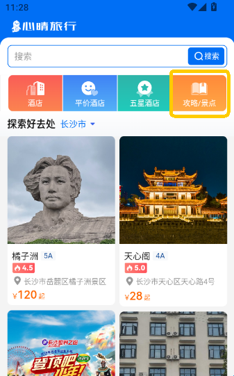 3、在软件首页界面,找到搜索框下面的“攻略/景点”功能按键点击进入