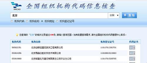 8、此时北京范围内的机构名称列表都可以看到,找到相应的单位就可以查询其全国组织机构代码了;