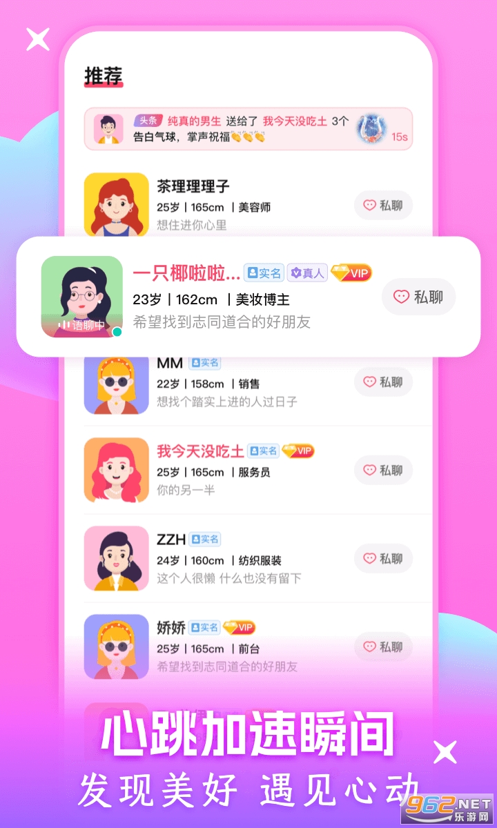 同城约会附近可聊针对用户的交友需求和同城位置进行精准推荐,强调了其严格的真人识别体系以及系统与人工审核相结合的方式,力图让用户迅速邂逅心仪的对象。,构建一个安全、真实的社交环境,让每位用户都能在这里放心寻找真爱。