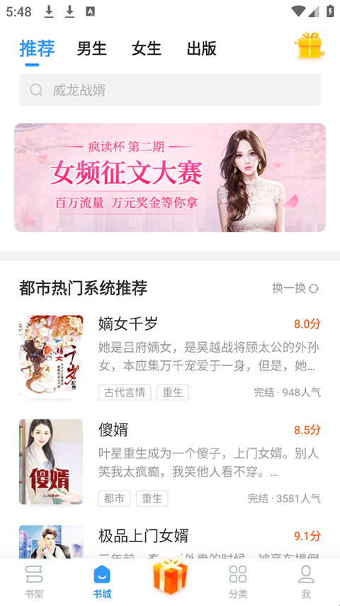 4、分类齐全:男频/女频,网罗都市、言情、玄幻、武侠、穿越、悬疑等热门分类,陪你度过每一个日夜。