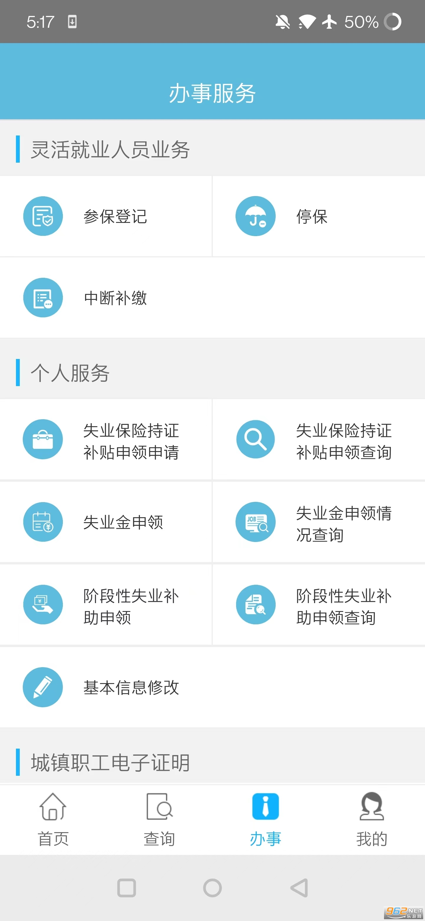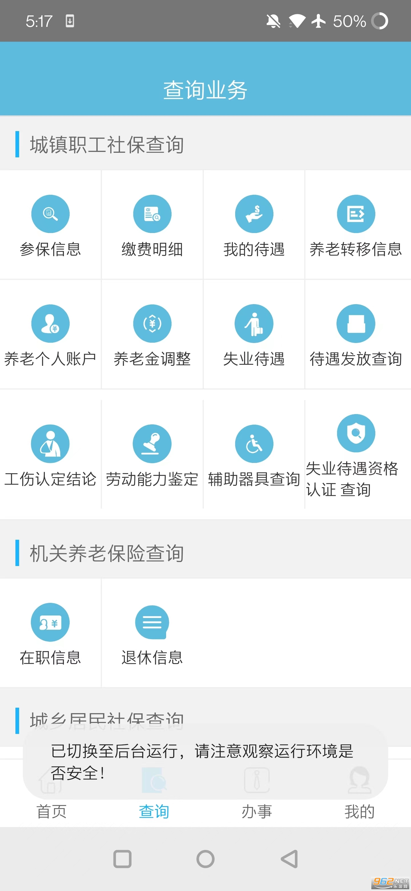 应用提供包含社会保障参保信息、待遇领取信息、养老金信息、定点医院/药店的查询、失业持证补贴申请、失业持证补贴申请查询等一系列功能。
