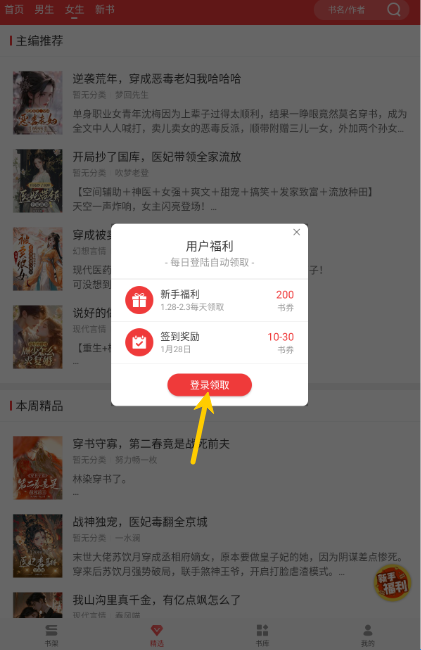 3、进入APP之后会有新人福利,直接点击“登录领取”,之后完成登录。