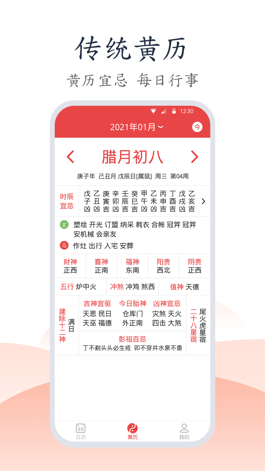 3.黄历:包括:二十四节气.吉凶宜忌.冲煞.合害.纳音.干支.十二神.胎神.星宿.月相.吉神凶煞.彭祖百忌.六曜.九星.流年.太岁.三元九运.玄空九星.星期.生肖.方位等等。