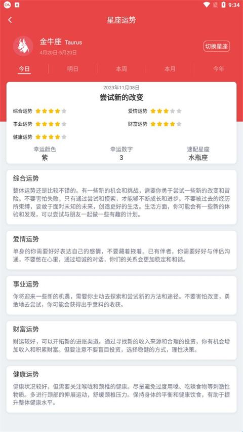 3、然后进入,可以查看到自己的综合运势、爱情运势、事业运势等;